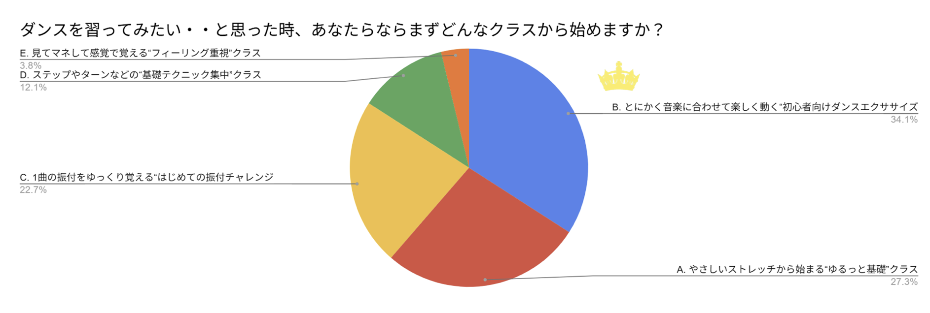 「A. ゆるっと基礎」(36.4%)と「C.振付チャレンジ」(36.4%)が二大人気であり同率。「B.初心者向け」はやや低めで(18.2%)、楽しさよりも達成感や学びを求める傾向にあるといえます。「E.フィーリング重視」はゼロという結果となりました。