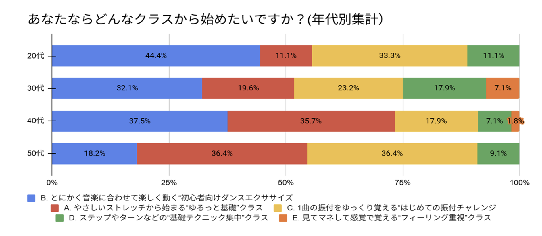 全世代でもっとも参加してみたいクラスは、B.とにかく音楽に合わせて楽しく動く初心者向けダンスエクササイズ”でした。全世代を通じて基本的なステップやターン練習、じっくり1曲の振り付けを取り組むというよりも「とにかく音楽に合わせて楽しくダンスをしたい」ということがみてとれます。