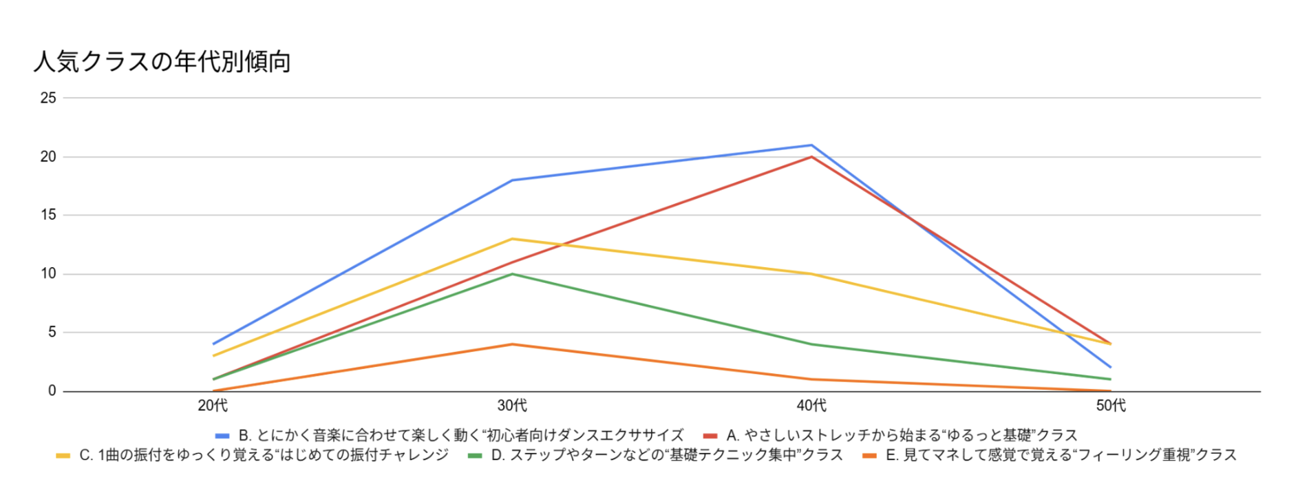- 50代 … 「基礎」と「振付チャレンジ」が同率トップ。ゆっくり学びつつ達成感を得られるクラスを好む。